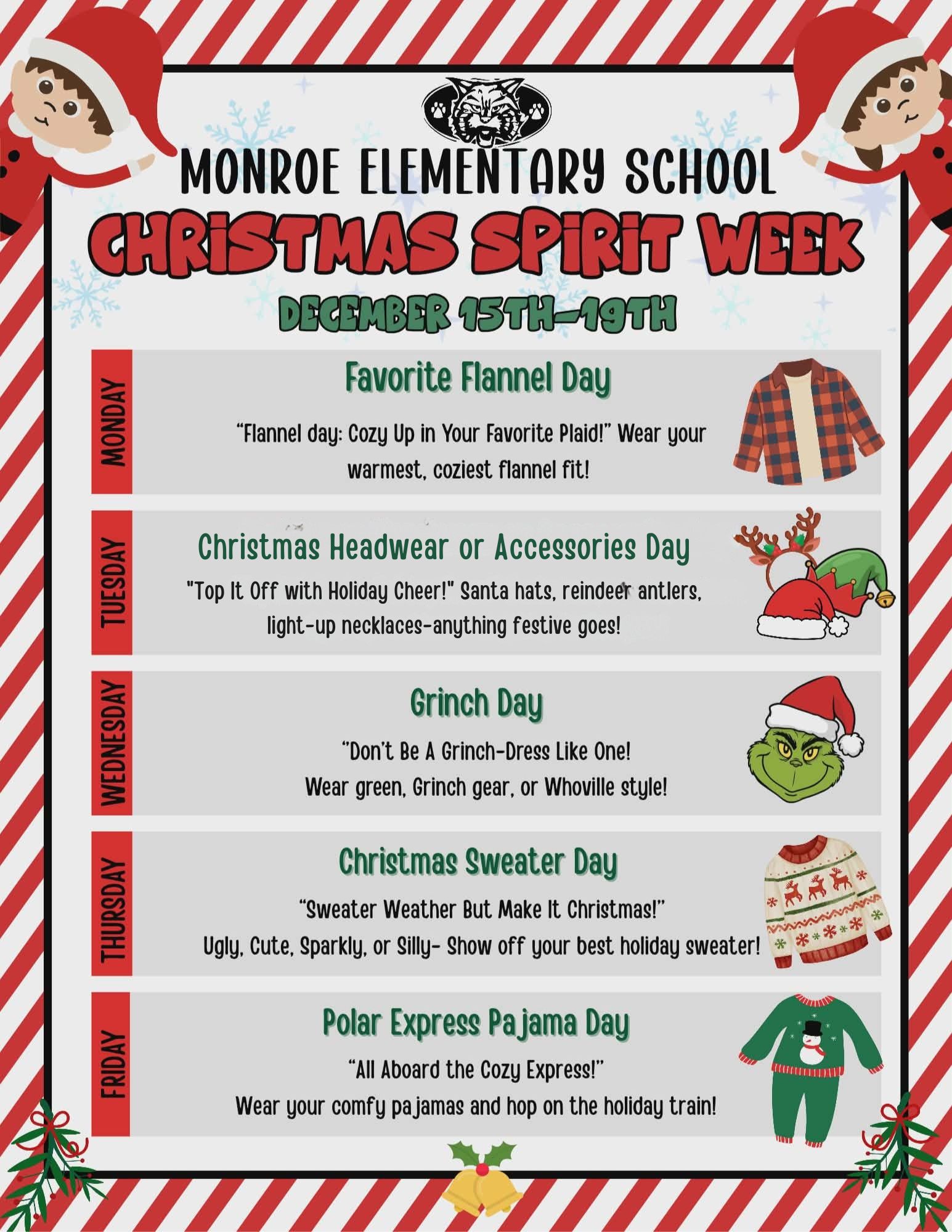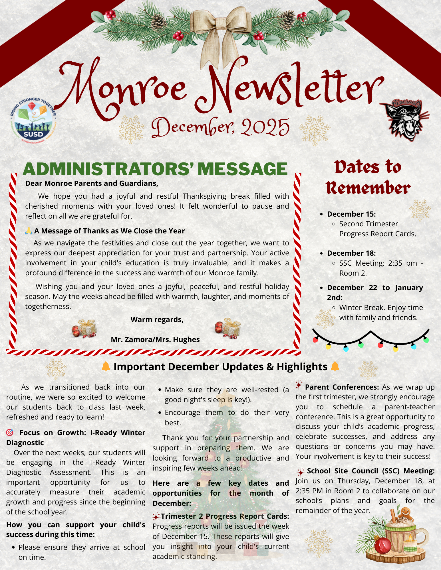 A festive newsletter titled 'Monroe Newsletter' with a December 2023 date.